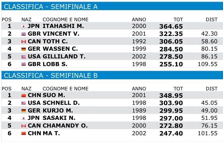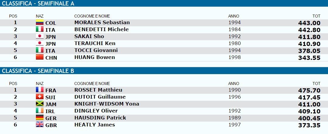 Le finali di questa gara, cosí come la piattaforma femminile, si svolgeranno sabato alle 18: passano il turno oltre all’azzurro Michele Benedetti, il colombiano Morales, il giapponese Sakai, il francese Rosset, lo svizzero Dutuoit ed il giamaicano Knight-Widsom.