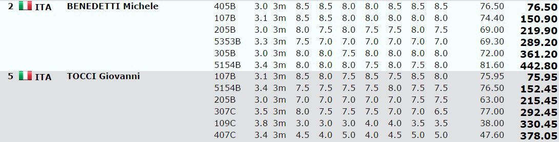 Purtroppo Tocci, che ha anche lui condotto fino a metá gara una prova eccellente, é incappato in errore proprio sul suo tuffo piú difficile, il quadruplo e mezzo avanti raggruppato. Con l’ultimo salto, il triplo e mezzo ritornato, avrebbe potuto recuperare solo eseguendolo in maniera perfetta, ma era un compito arduo ed il cosentino si é cosí fermatoin quinta posizione con 378.05 punti.