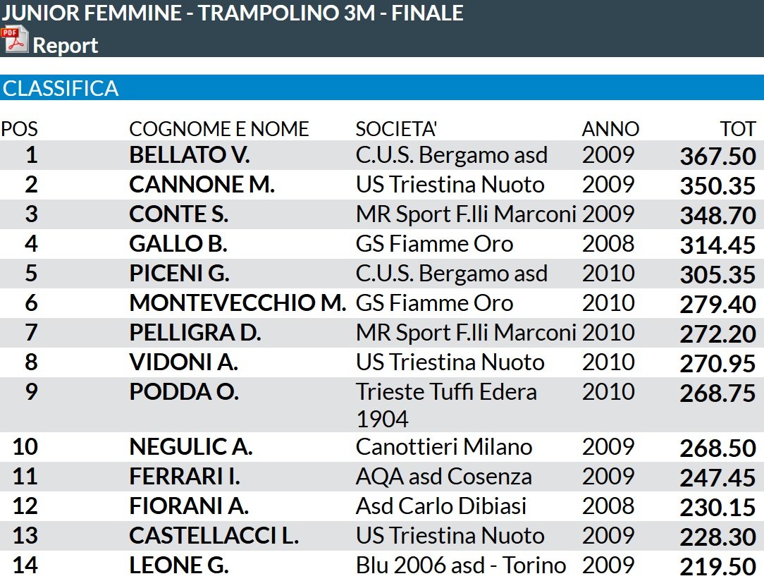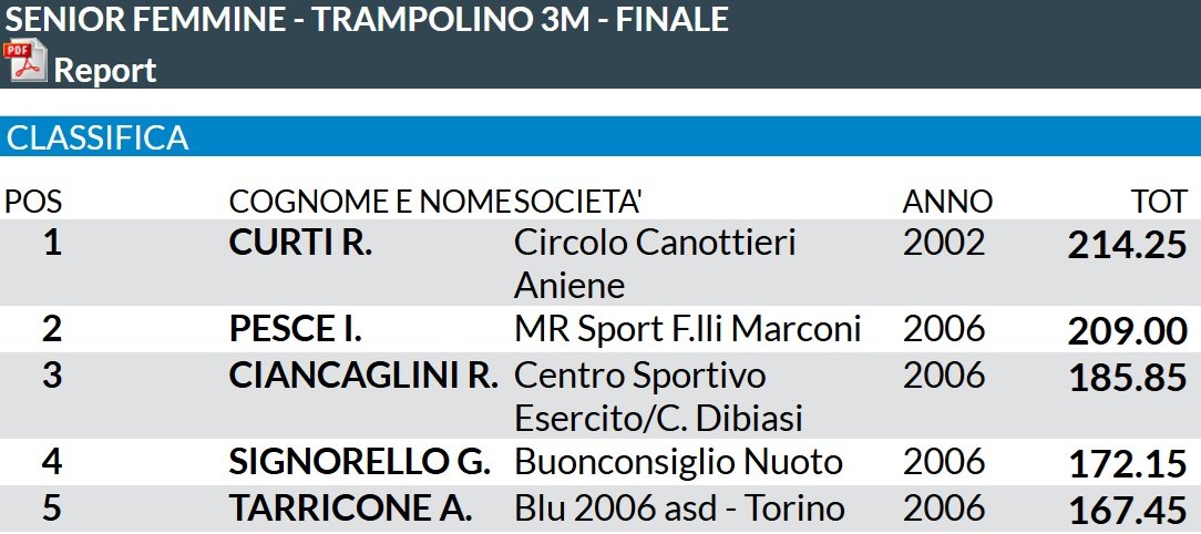 Soltanto cinque le Senior in corsa per la gara dal trampolino 3 metri: a spuntarla per la vittoria è stata Rebecca Jade Curti (Canottieri Aniene) con 214.25 punti, mentre è stata Irene Pesce (M.R. Sport), già vincitrice dalla piattaforma, a conquistare l’argento con 209 punti netti; terza piazza per Rebecca Ciancaglini (Esercito) con 185.85 punti.