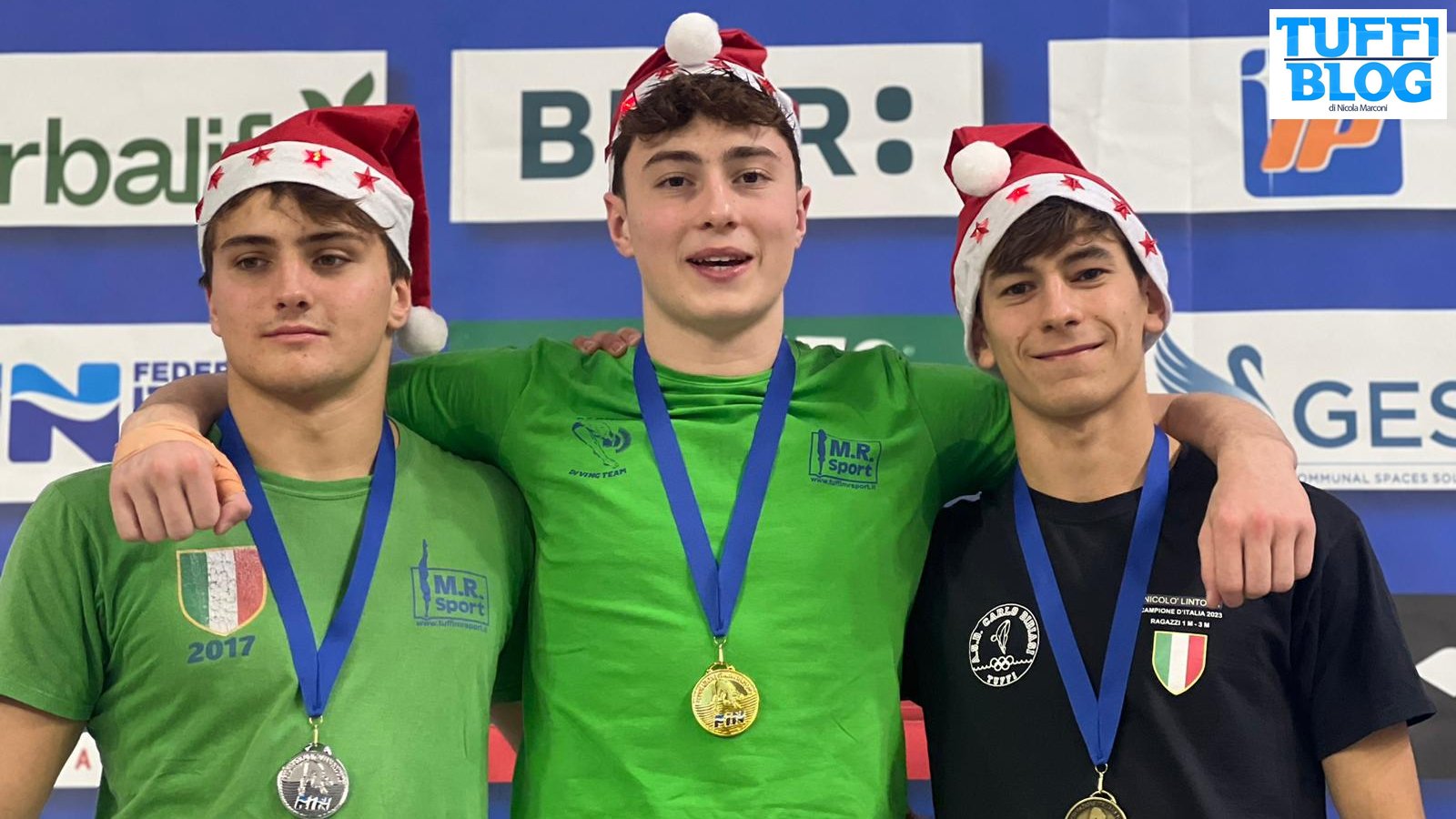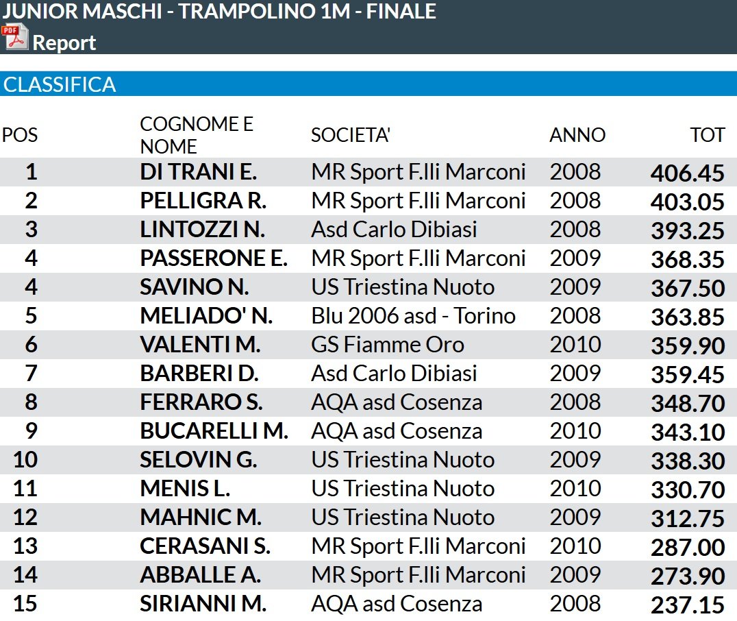 In sedici i tuffatori Juniores al via per la gara maschile dal trampolino 1 metro, che si è rivelata piuttosto vivace: doppietta M.R. Sport con Emmanuel Di Trani che si aggiudica la medaglia d’oro con 406.45 punti (e raggiunge il punteggio limite per gli Europei giovanili), e Raffaele Pelligra medaglia d’argento con 403.05 punti. Completa il podio Nicolò Lintozzi (Dibiasi) con 393.25 punti.
