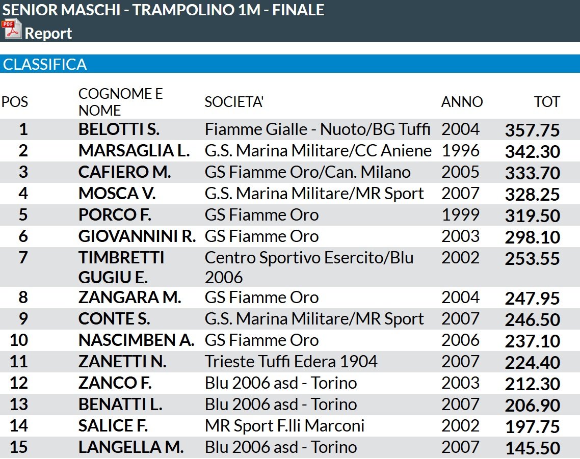 Più partecipata l’ultima gara di giornata, il trampolino 1 metro Senior maschile, con quindici atleti al via. Vittoria e oro per Stefano Belotti (Fiamme Gialle) con 357.75 punti, davanti a Lorenzo Marsaglia (Marina Militare) con 342.30 punti e a Matteo Cafiero (Fiamme Oro) con 333.70 punti.