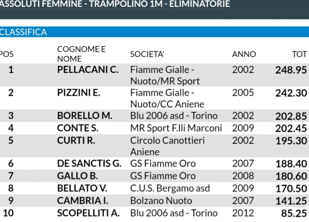 Ad aprire la seconda giornata di gare l’eliminatoria femminile dal trampolino 1 metro, con dieci atlete al via. Corsa a due per la vetta provvisoria, con Chiara Pellacani (Fiamme Gialle) che prevale con 248.95 punti sulla compagna di squadra Elisa Pizzini (Fiamme Gialle), seconda con 242.30 punti; centrano la finale diretta anche Matilde Borello (Blu 2006), Sofia Conte (M.R. Sport), Rebecca Jade Curti (Canottieri Aniene) e Giorgia De Sanctis (Fiamme Oro).