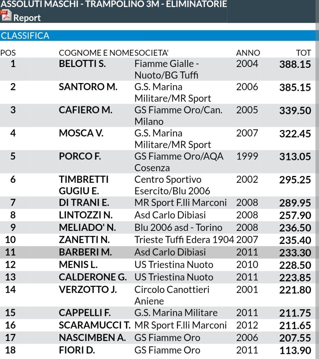 Ben diciotto, invece, i tuffatori dell’unica eliminatoria maschile di oggi, quella dal trampolino 3 metri: anche qua due atleti si sono contesi la vetta per tutta la gara, con Stefano Belotti (Fiamme Gialle) a quota 388.15 punti e Matteo Santoro (Marina Militare) subito dietro con 385.15 punti. Si qualificano direttamente in finale anche Matteo Cafiero (Fiamme Oro), Valerio Mosca (Marina Militare), Francesco Porco (Fiamme Oro) ed Eduard Timbretti Gugiu (Esercito).