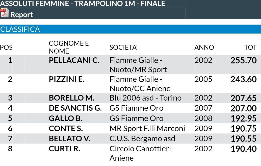 La prima finale di oggi è stata quella femminile dal trampolino 1 metro, che è stata quasi una fotocopia di quella di ieri dal trampolino più alto: con 255.70 punti Chiara Pellacani (Fiamme Gialle) ha prevalso con decisione su Elisa Pizzini (Fiamme Gialle), argento con 243.60 punti. Cambia la medaglia di bronzo: Matilde Borello (Blu 2006) è terza per un soffio con 207.65 punti.