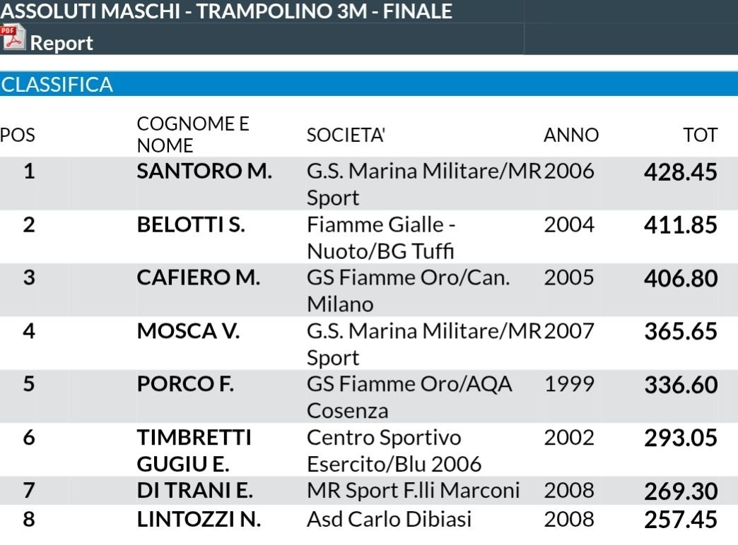 A seguire la finale maschile dal trampolino 3 metri, di buon livello e molto vivace. Matteo Santoro (Marina Militare) concede il bis e anche lui ottiene il suo secondo oro personale con 428.45 punti; con lui sul podio Stefano Belotti (Fiamme Gialle), argento con 411.85 punti, e Matteo Cafiero (Fiamme Oro), bronzo con 406.80 punti.