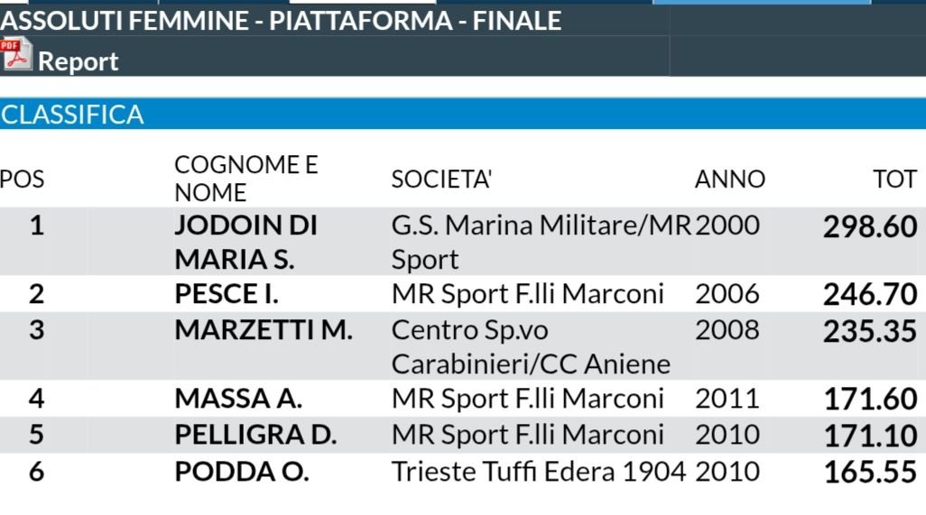 Sono state le piattaformiste a chiudere la giornata, con soltanto sei finaliste: larga vittoria per Sarah Jodoin di Maria (Marina Militare) che si conferma regina della specialità con 298.60 punti. Irene Pesce (M.R. Sport) è argento con 246.70 punti, mentre completa il podio con 235.35 punti Matilde Marzetti (Carabinieri).