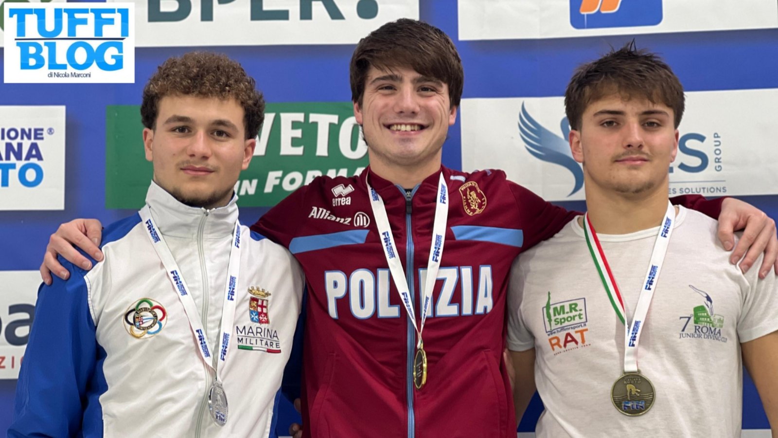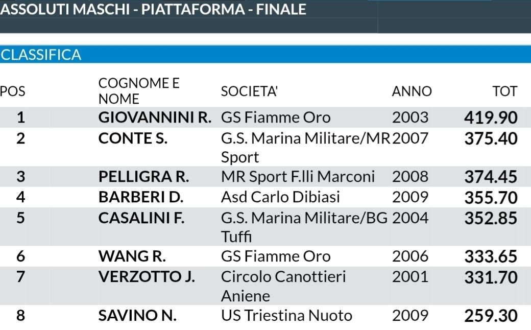 La lunga giornata si è infine conclusa con la finale maschile dalla piattaforma, dove non sono mancati tuffi spettacolari (anche da 9) tra gli aspiranti alle medaglie, e continui colpi di scena. Percorso netto per Riccardo Giovannini (Fiamme Oro), che come in eliminatoria è l’unico a salire sopra “quota 400” e si aggiudica l’ultimo oro di giornata con 419.90 punti. Distanziati da meno di un punto, invece, gli altri due medagliati: argento per Simone Conte (Marina Militare) con 375.40 punti, bronzo per Raffaele Pelligra (M.R. Sport) con 374.45 punti.