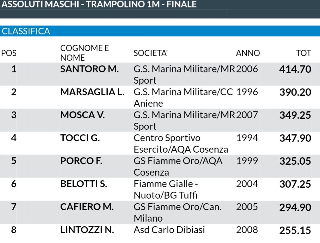 Alle 17 via alle finali, partendo proprio dal trampolino 1 metro dove si è delineata una corsa a quattro per il podio: netta la vittoria di Matteo Santoro (Marina Militare), che con 414.70 punti si aggiudica oro e vittoria davanti a Lorenzo Marsaglia (Marina Militare) con 390.20 punti. Bravo Valerio Mosca (Marina Militare) ad approfittare delle sbavature di Giovanni Tocci (CS Esercito): con 349.25 punti il giovane romano strappa il bronzo e completa un podio “monocolore”.