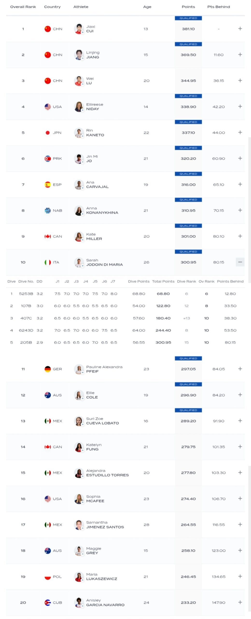 A seguire l’eliminatoria dalla piattaforma, dove Sarah Jodoin di Maria ha fatto percorso netto, superando ancora una volta i 300 punti e qualificandosi agevolmente alla finale con il decimo posto in classifica e il nono posto utile con 300.95 punti. Nessun errore di rilievo per lei e anzi ottimo i suoi doppio e mezzo indietro con avvitamento e sul doppio e mezzo indietro dalla verticale con avvitamento, e potrà ottenere agevolmente almeno una decina di punti in più mettendo a punto gli altri tuffi.