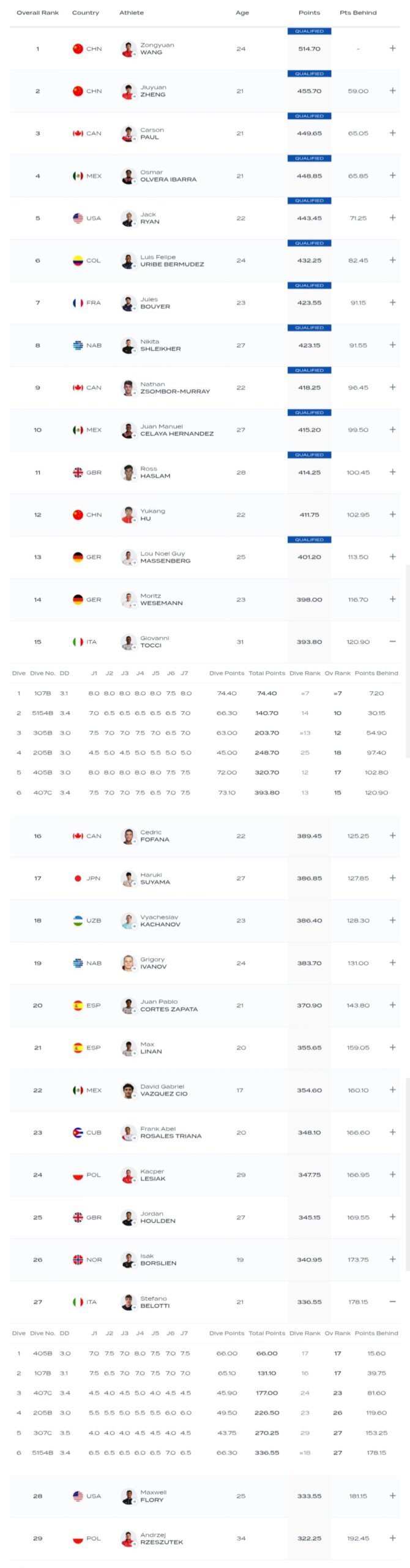 Meno chance per Stefano Belotti, ventisettesimo con 336.55 punti: troppo difficile recuperare dopo gli ertori nel triplo e mezzo ritornato raggruppato, doppio e mezzo indietro carpiato e triplo e mezzo rovesciato raggruppato per poter pensare di rientrare nel lotto dei qualificati. L’esperienza all’estero resta comunque preziosa per un atleta giovane.