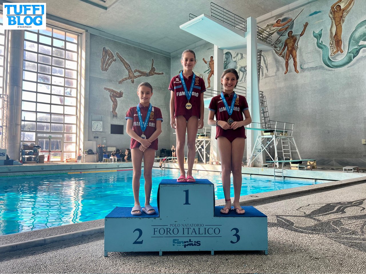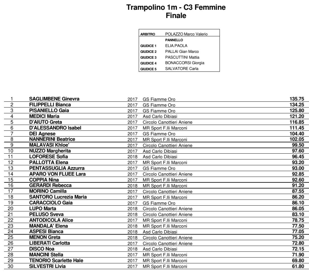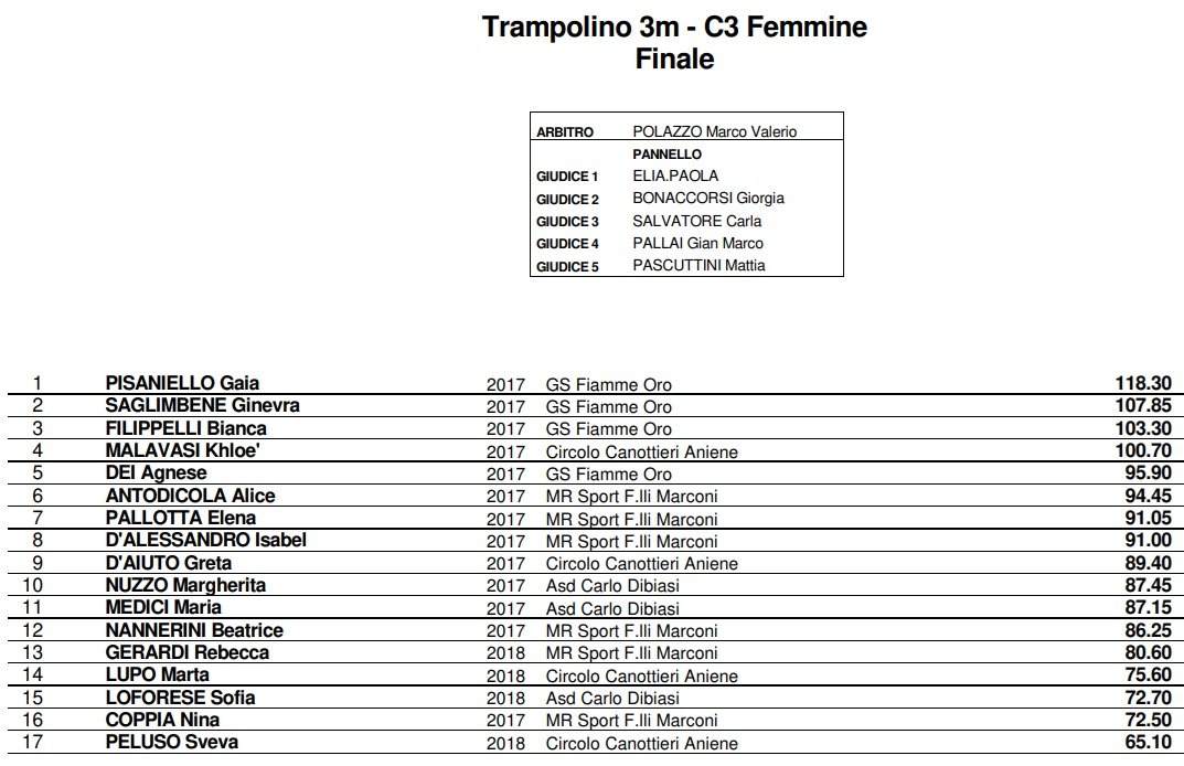 A seguire la gara femminile dal trampolino 3 metri, con diciassette partecipanti al via e un podio “monocolore” delle Fiamme Oro: vittoria per Gaia Pisaniello con 118.30 punti, davanti alle compagne di squadra Ginevra Saglimbene (107.85 punti) e Bianca Filippelli (103.30 punti).