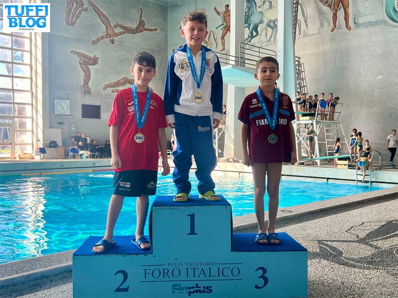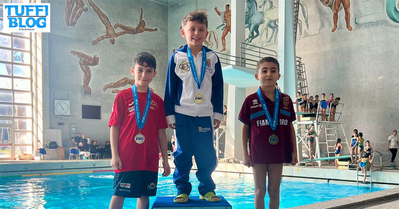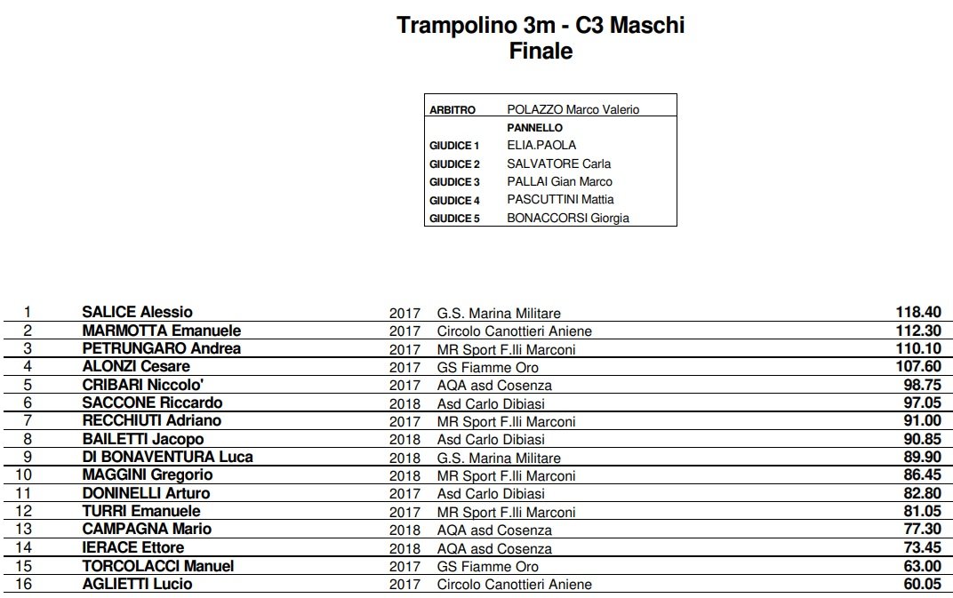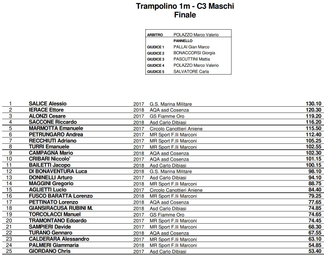 Ad aprire la giornata la gara maschile dal trampolino 1 metro, con venticinque giovani tuffatori pronti a sfidarsi. È stato Alessio Salice (Marina Militare), con 130.10 punti, ad aggiudicarsi la prima medaglia d’oro di questa competizione: salgono sul podio anche il debuttante Ettore Ierace (AQA Cosenza) con 120.30 punti e Cesare Alonzi (Fiamme Oro) con 119.20 punti (foto in apertura).