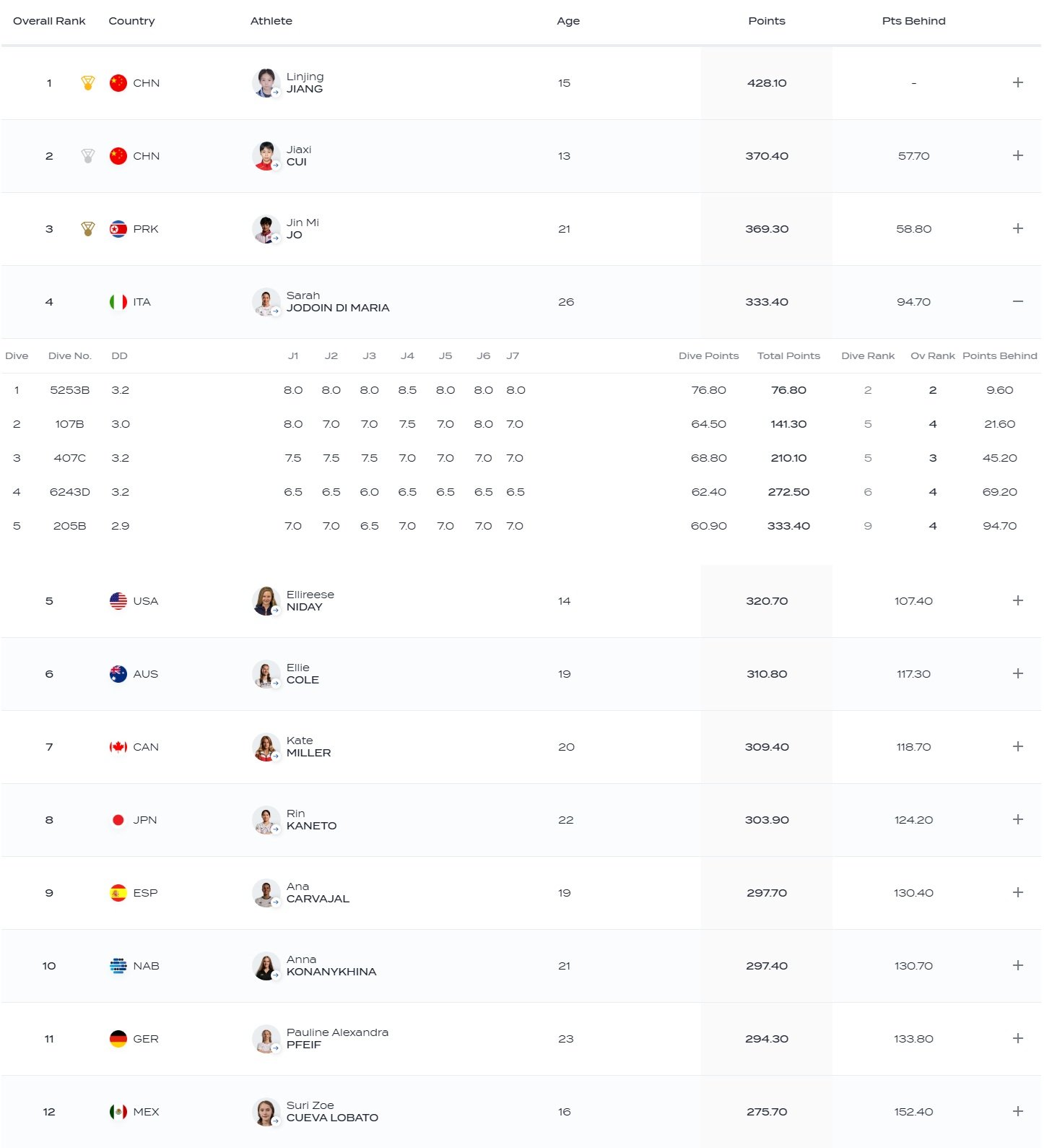 Davanti a lei solo le atlete asiatiche, padrone incontrastate da anni della specialità, a sottolineare l’ottima prova dell’italiana: oro alla cinese Jiang Linjing con 428.10 punti, davanti alla connazionale Cui Jiaxi con 370.40 punti e all’atleta della Corea del Nord Jo Jin Mi con 369.30 punti.