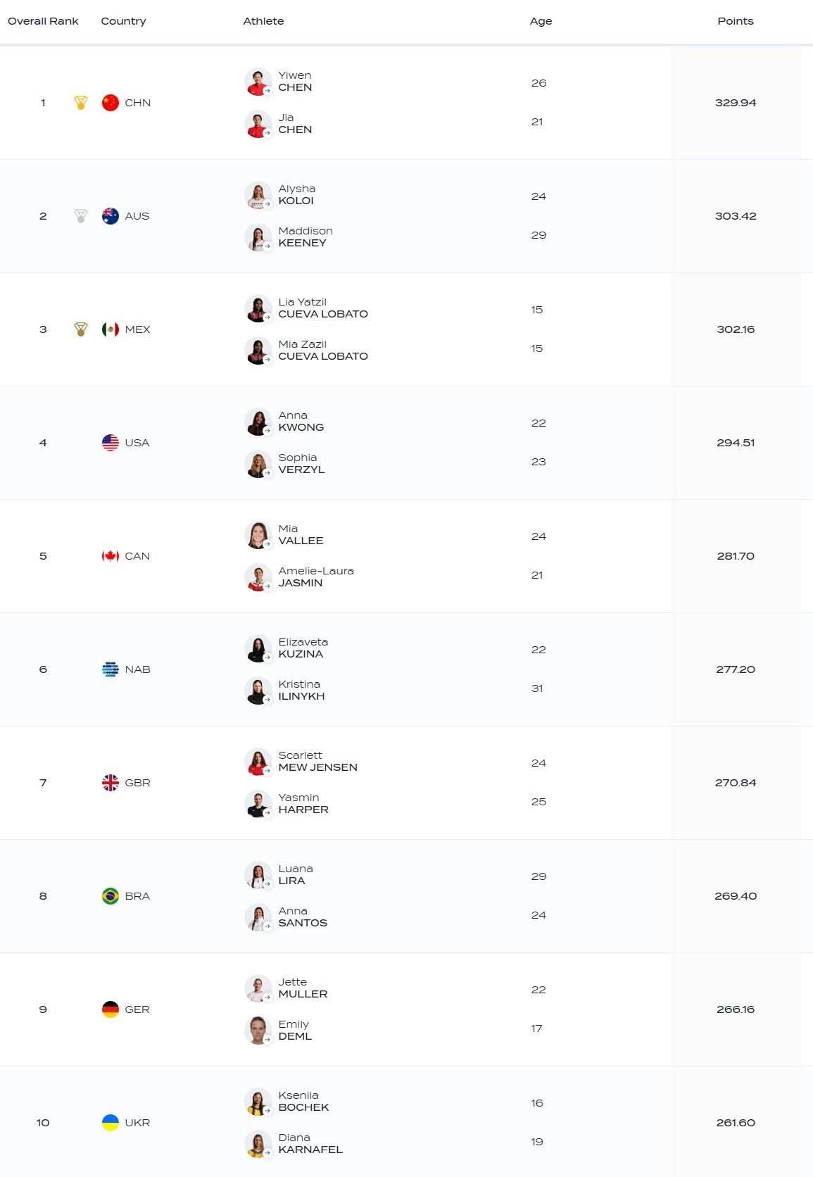La quarta giornata di Diving World Cup si è aperta con la finale sincro trampolino femminile, che ha rispettato i pronostici della vigilia: oro alle cinesi Chen Yiwen / Chen Jia con 329.94 punti, davanti alle australiane Alysha Koloi / Maddison Keeney con 303.42 punti e alle gemelline messicane Lia e Mia Cueva Lobato con 302.16 punti.