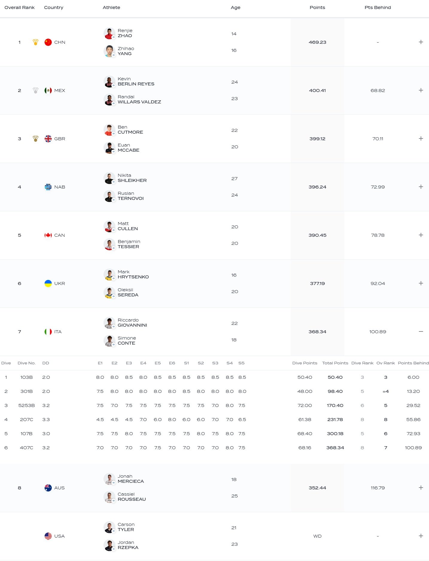 Oro alla Cina di Zhao Renjie / Yang Zhihao con 469.23 punti, davanti al Messico di Kevin Berlin Reyes / Randal Willars Valdez con 400.41 punti e alla Gran Bretagna di Ben Cutmore / Euan McCabe con 399.12 punti.