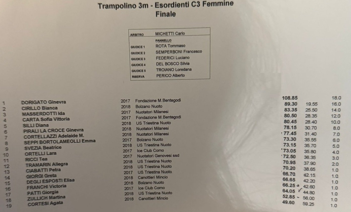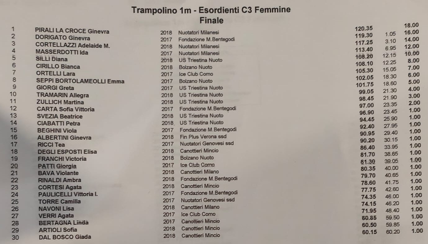 La terza gara in programma è stata quella femminile dal trampolino 3 metri. Diciannove le atlete al via, con Ginevra Dorigato che ha conquistato l’oro con 108.85 punti e un largo vantaggio sulle inseguitrici. Completano il podio la debuttante in categoria Bianca Cirillo (Bolzano Nuoto) con 89.30 punt e Ida Masserdotti (Nuotatori Milanesi) con 83.35 punti.