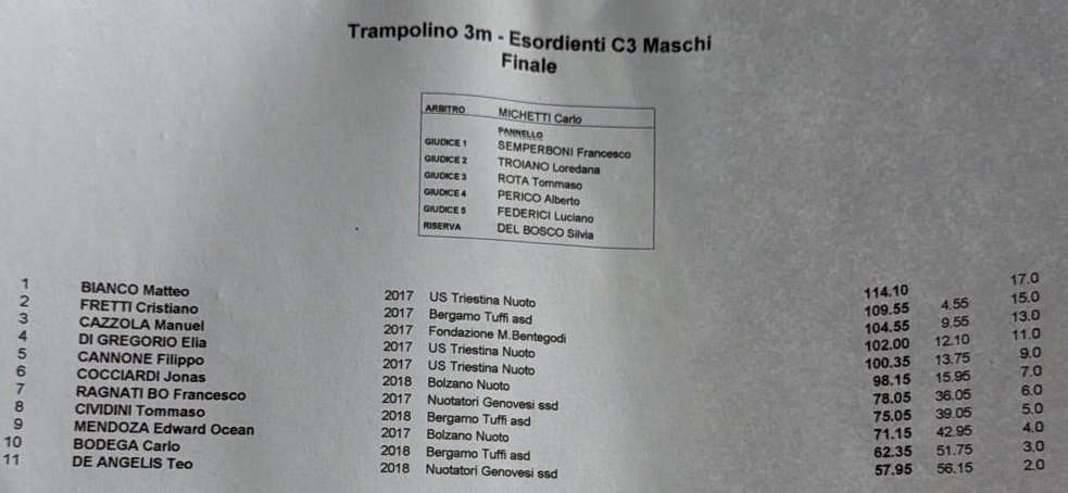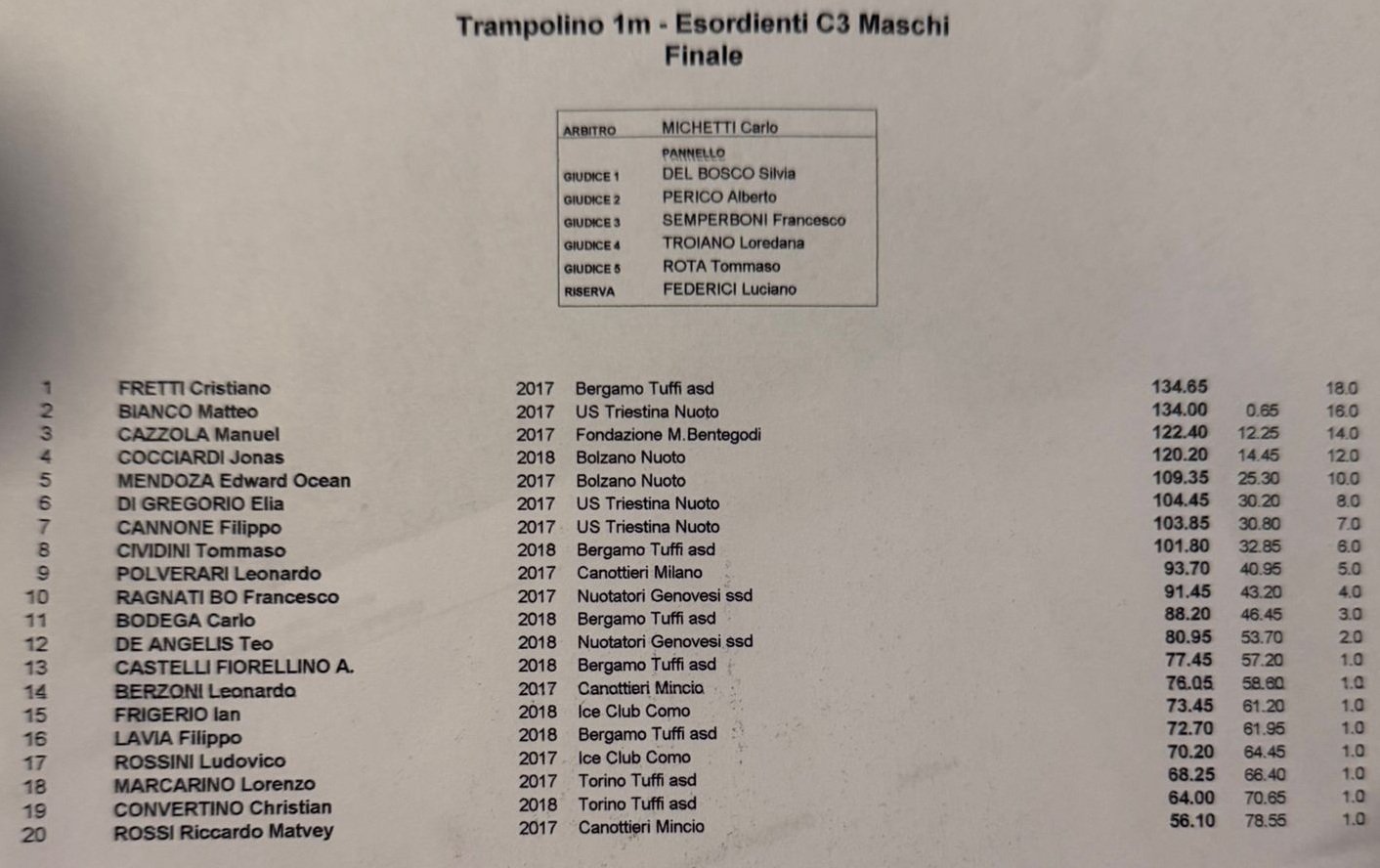 Venti i tuffatori pronti a sfidarsi nell’ultima gara di giornata, il trampolino 1 metro maschile, con lo stesso podio – a posizioni invertite – della gara dal trampolino più alto: questa volta è stato Cristiano Fretti a vincere con 134.65 punti, di un’incollatura su Matteo Bianco con 134 punti netti. Ancora un bronzo per Manuel Cazzola che chiude il podio con 122.40 punti.