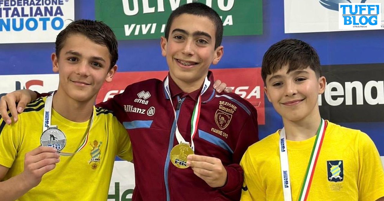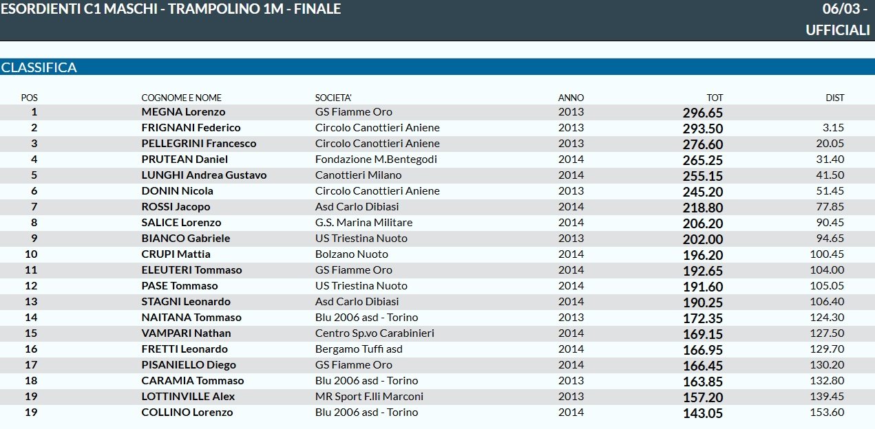Venti invece i tuffatori dal trampolino 1 metro, con l’ultimo oro di giornata assegnato a Lorenzo Megna (Fiamme Oro) con 296.65 punti; con lui sul podio due atleti del Circolo Canottieri Aniene, Federico Frignani, secondo con 293.50 punti, e Francesco Pellegrini, terzo con 276.60 punti.