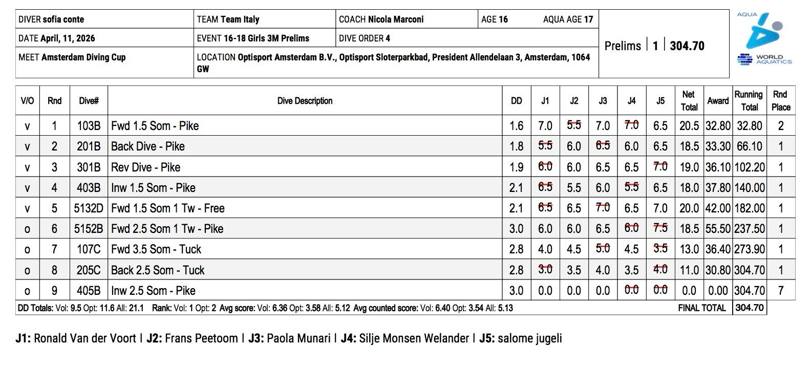 Nella prima eliminatoria in programma, dal trampolino di 3 metri per la categoria “A” (Juniores) femminile, Sofia Conte ha condotto una buona gara fino all’ultimo tuffo, il doppio e mezzo ritornato carpiato, in cui ha però commesso un errore grave. Troppo sbilanciata, la parabola non è stata quella corretta e la tuffatrice ha toccato il trampolino con i talloni, non completando la rotazione.