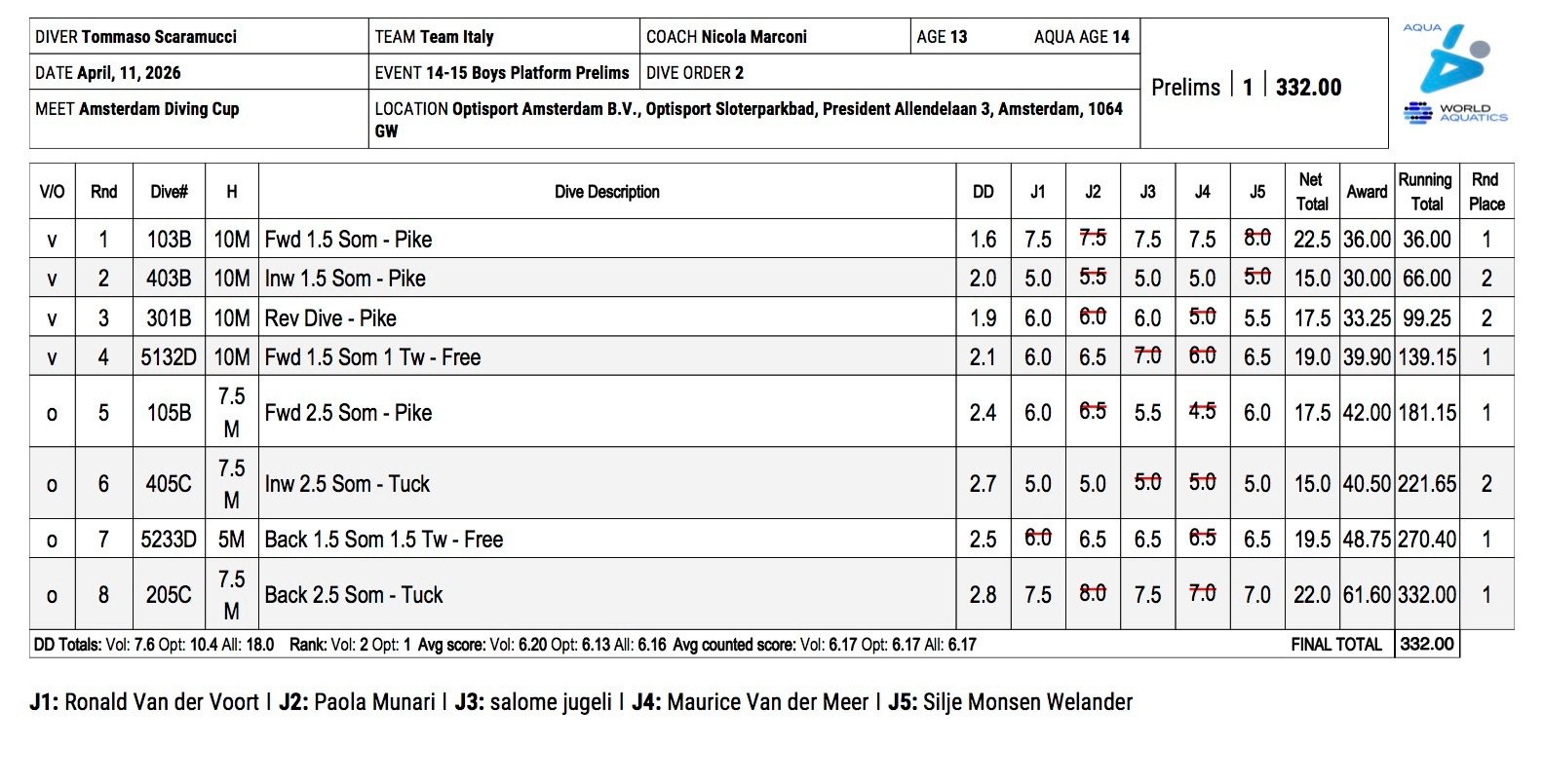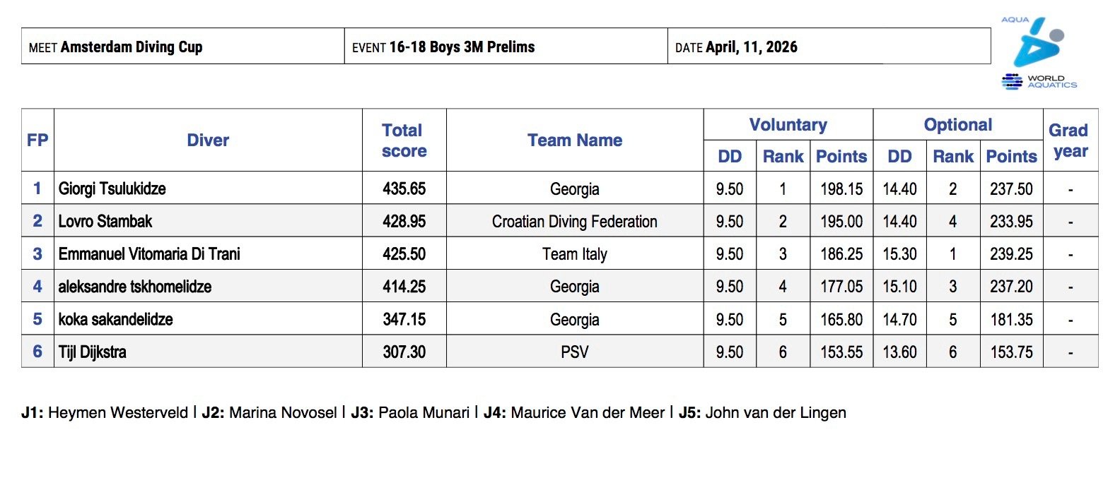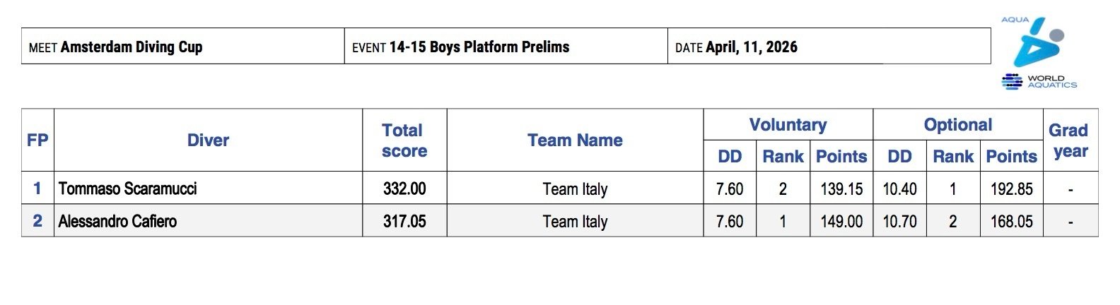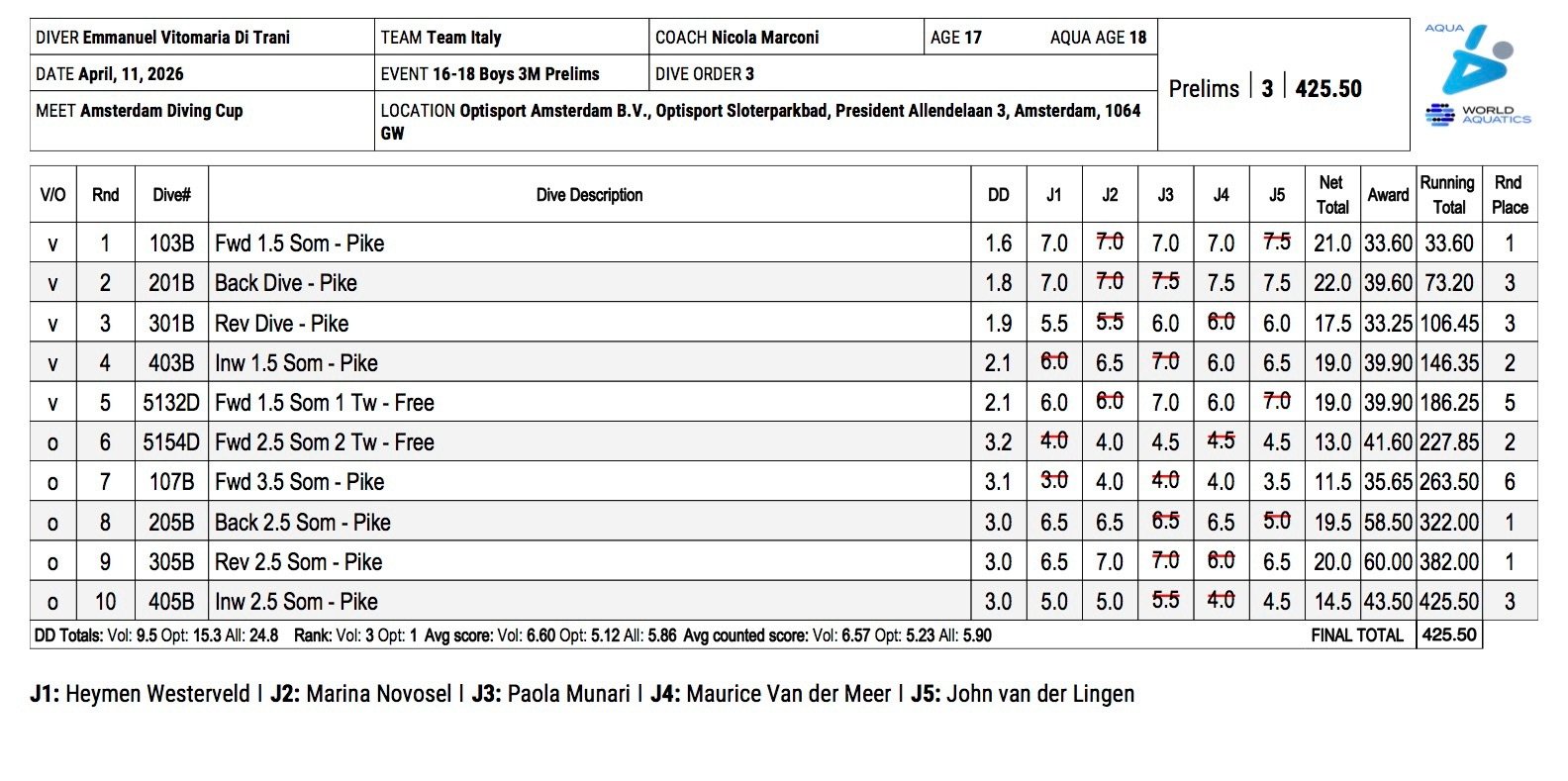 Per l’ultima eliminatoria di questo sabato mattina, il trampolino maschile categoria “A” (Juniores), Emmanuel Di Trani ha passato il turno senza particolari problemi, nonostante quella di questa mattina non sia stata un prova brillante. Buoni i tuffi obbligatori, qualche difficoltà sugli stacchi del doppio e mezzo avanti carpiato con due avvitamenti e del triplo e mezzo qvanti carpiato. Per lui la terza posizione con 425.50 punti, lo precedono il croato Lovro Stambak secondo con 428.95 punti e il georgiano Giorgi Tsukukidze primo con 435.65 punti.
