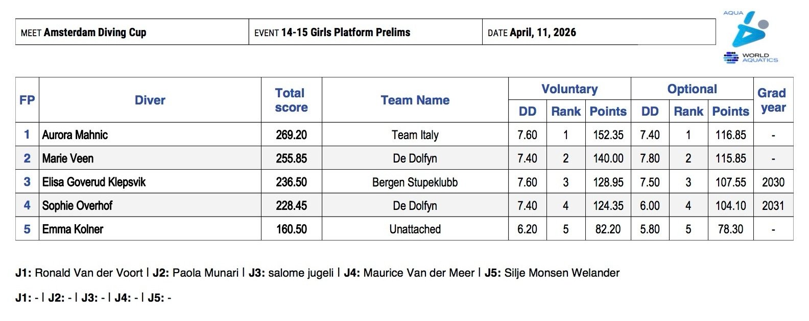Molto bene la Mahnic al suo esordio in nazionale giovanile: grazie a degli ottimi obbligatori e a dei buoni tuffi liberi – unica imprecisione l’entrata del doppio e mezzo ritornato raggruppato – la tuffatrice triestina ha guidato la classifica dall’inizo alla fine della prova, chiudendo con 269.20 punti.