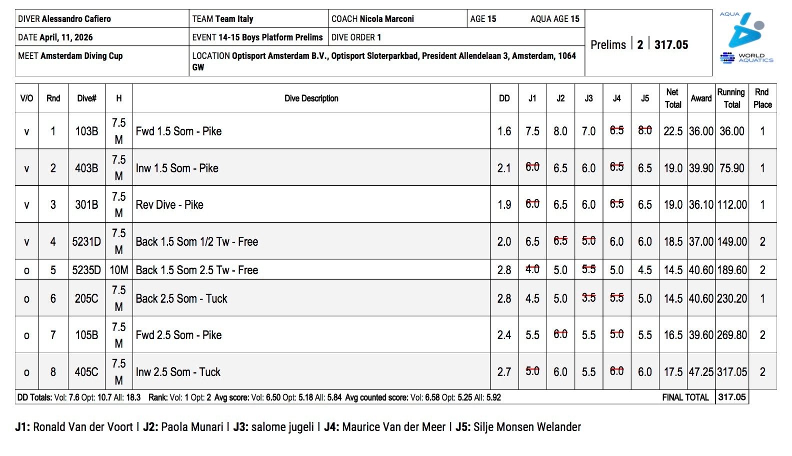 Nonostante il tuffo nullo comunque Conte aveva accumulato un vantaggio tale da restare in testa alla classifica con 304.70 punti e ha cosi passato il turno preliminare.