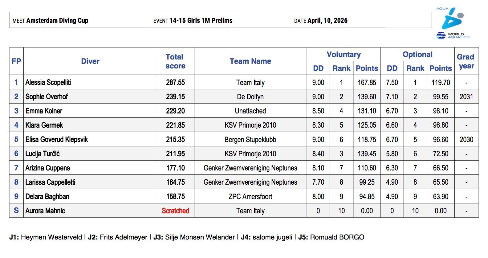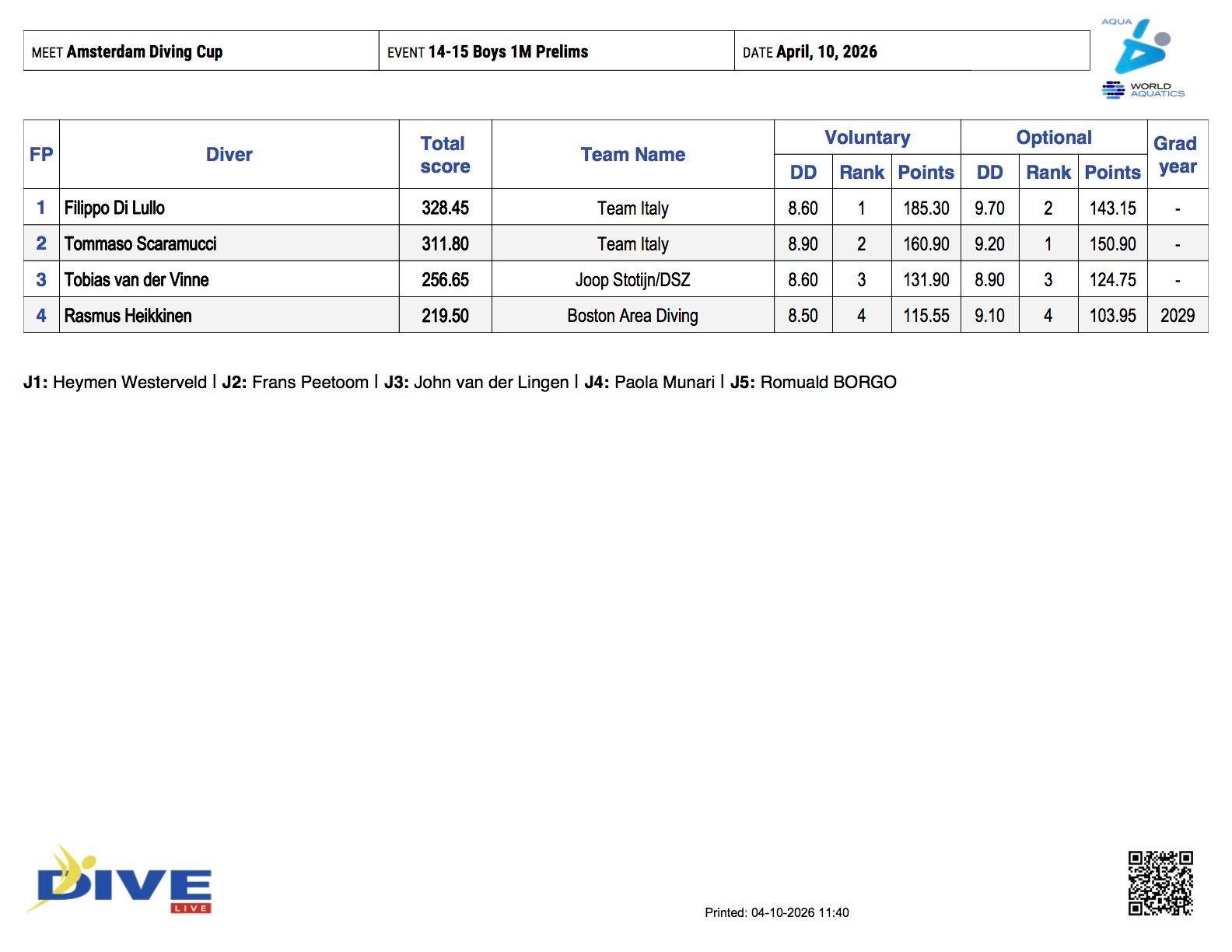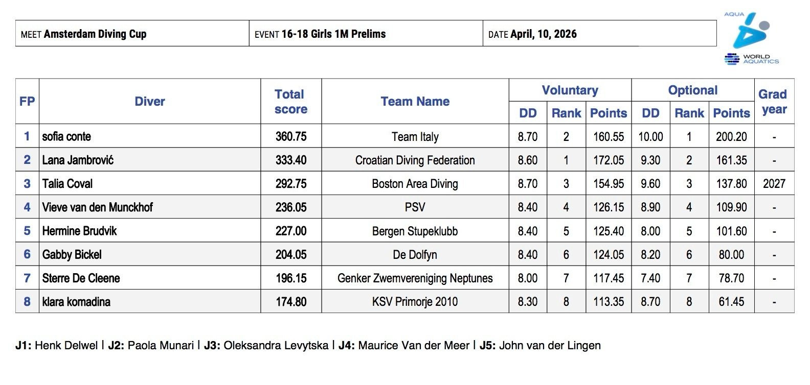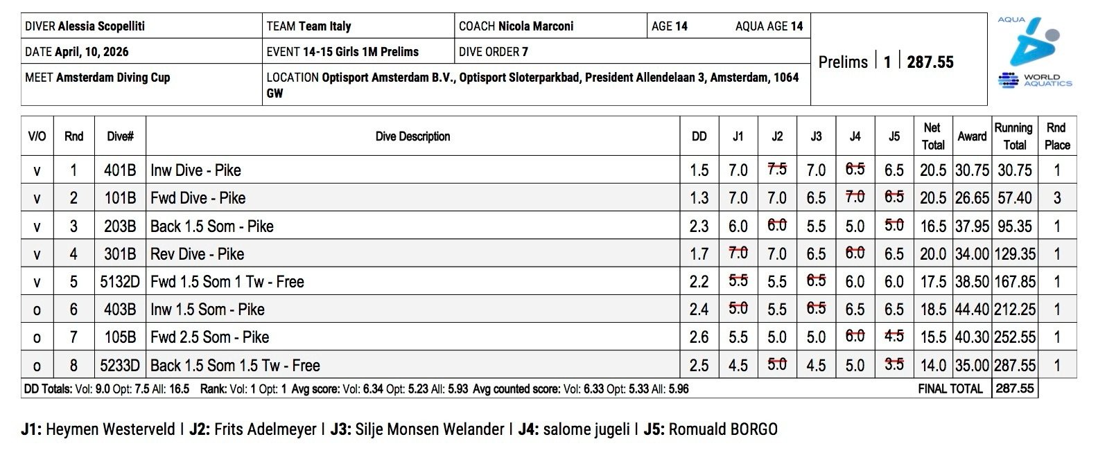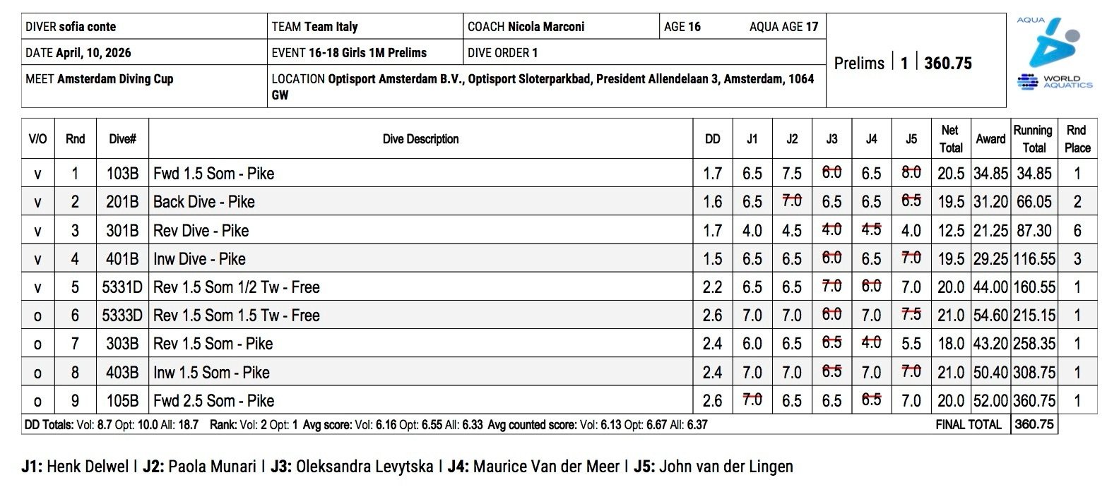La seconda giornata di gare dell’Amsterdam Diving Cup ha visto le tuffatrici e i tuffatori azzurri tutti impegnati dal trampolino di 1 metro.