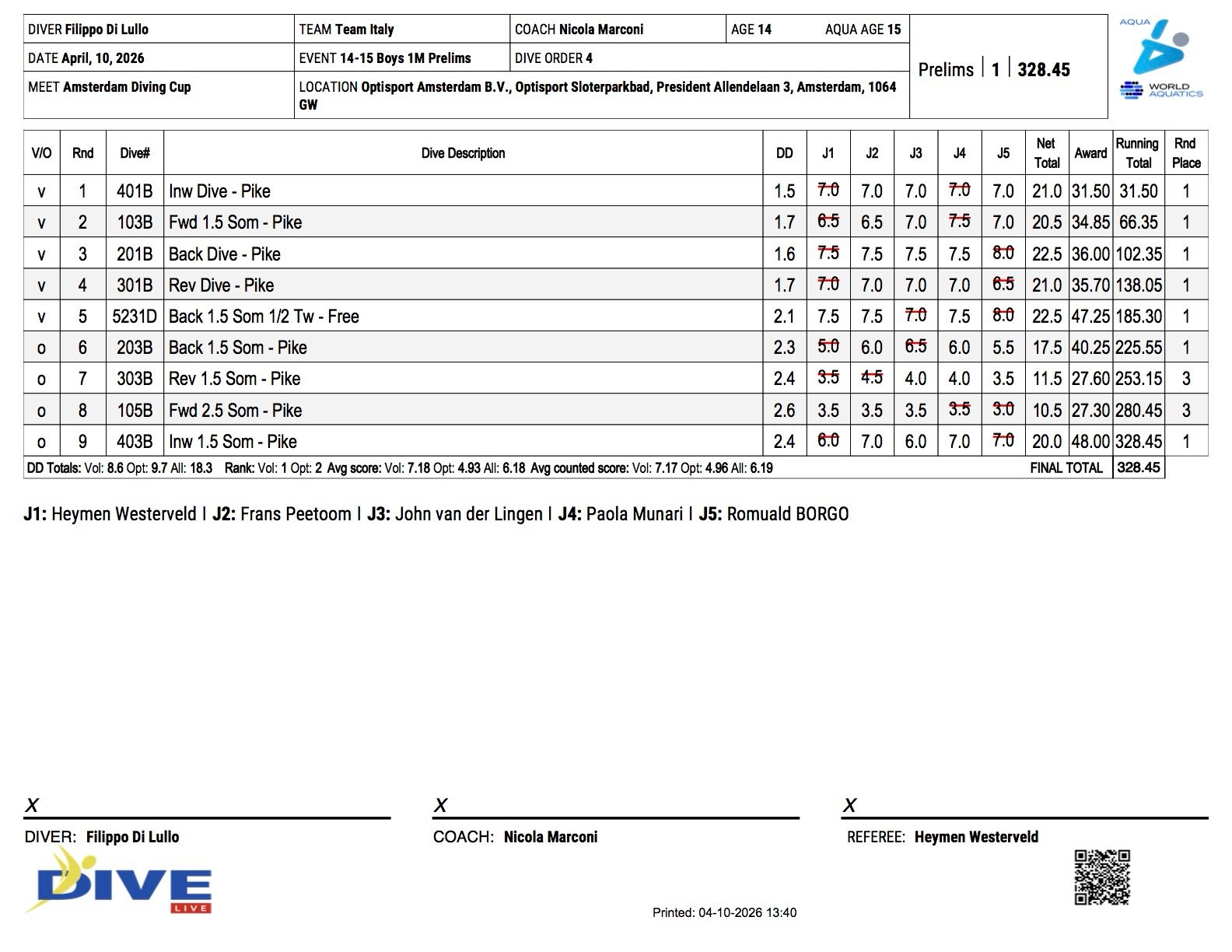 Entrambi i ragazzi hanno salto molto bene, commettendo però due errori a testa: Di Lullo, qualificatosi con il primo punteggio (328.45 punti), ha eseguito degli ottimi obbligatori, ma ha sbagliato l’apertura dell’uno e mezzo rovesciato carpiato e lo stacco del doppio e mezzo avanti carpiato. Scaramucci, classificatosi secondo (311.80 punti), ha “sporcato” il punteggio degli obbligatori con un errore nell’entrata dell’uno e mezzo ritornato e un altro nell’apertura dell’uno e mezzo indietro carpiato.