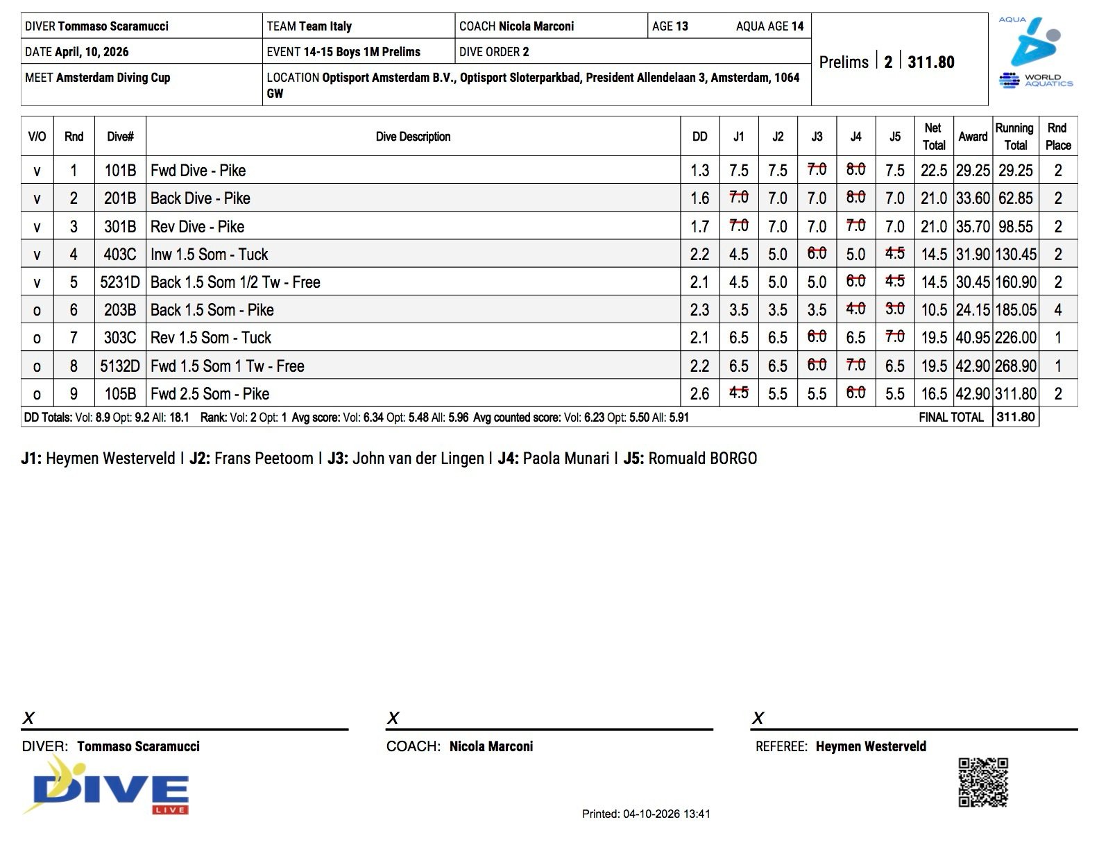 A chiudere questa seconda tornata di eliminatorie Filippo Di Lullo e Tommaso Scaramucci, sempre dal trampolino di 1 metro per la categoria B (Ragazzi). Entrambi gli atleti ieri hanno conquistato una medaglia dal trampolino di 3 metri: quella d’oro per Scaramucci e quella d’argento per Di Lullo.