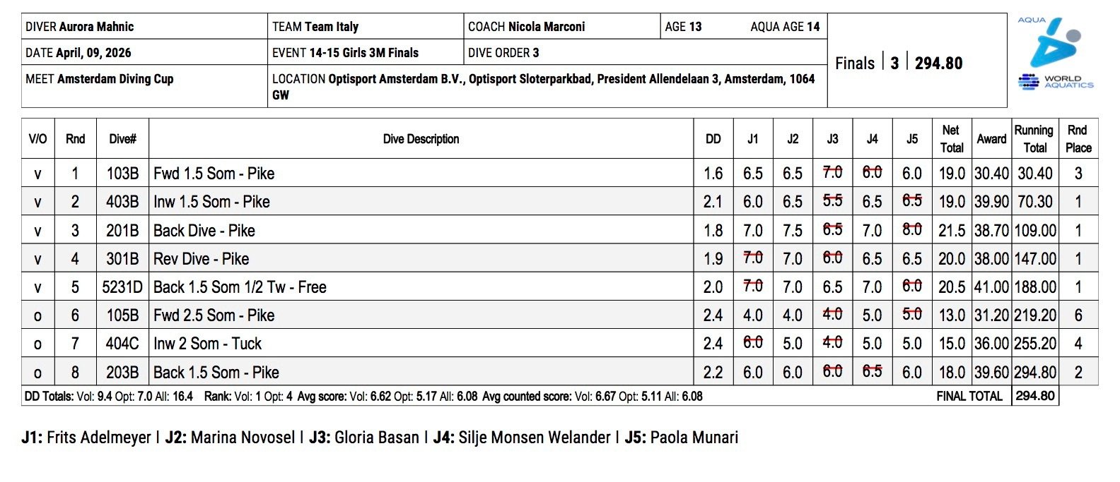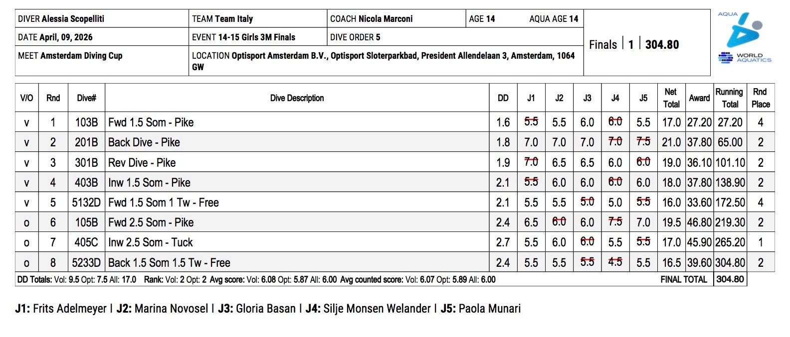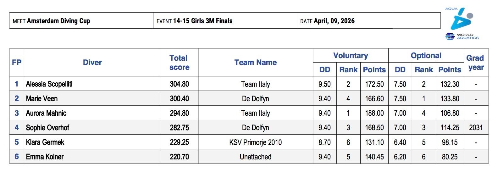 Tra di loro, a soli 4 punti di distanza da Alessia, ma a 6 da Aurora, la tuffatrice olandese Marie Veen, seconda appunto con 300.40 punti.
