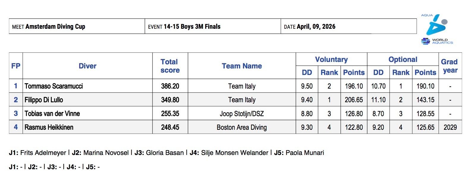A completare il podio il tuffatore olandese Tobias van der Vinne con 255.35 punti.