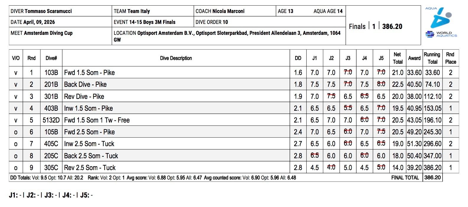 Ancora una volta Scaramucci ha condotto una buona prova, senza particolari errori nonostante un programma gara differente e più difficile rispetto a quello eseguito al mattino in eliminatoria. Bene i primi tre tuffi liberi, il doppio e mezzo avanti carpiato, il doppio e mezzo ritornato raggruppato ed il doppio e mezzo indietro raggruppato. Meno preciso il presalto del doppio e mezzo rovesciato raggruppato, ma il giovane tuffatore, primo anno in categoria, è riuscito comunque a recuperare portando a termine il tuffo senza troppi problemi. Come questa mattina si è aggiudicato la vittoria con 386.20 punti.