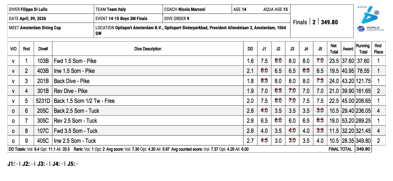 Qualche errore in più per Di Lullo che rispetto al mattino perde qualche punto ma mantenendo comunque la seconda posizione, questa volta con 349.80 punti. Molto buono doppio e mezzo rovesciato raggruppato, ma ancora qualche incertezza sul doppio e mezzo ritornato raggruppato dove è mancata un’apertura decisa.