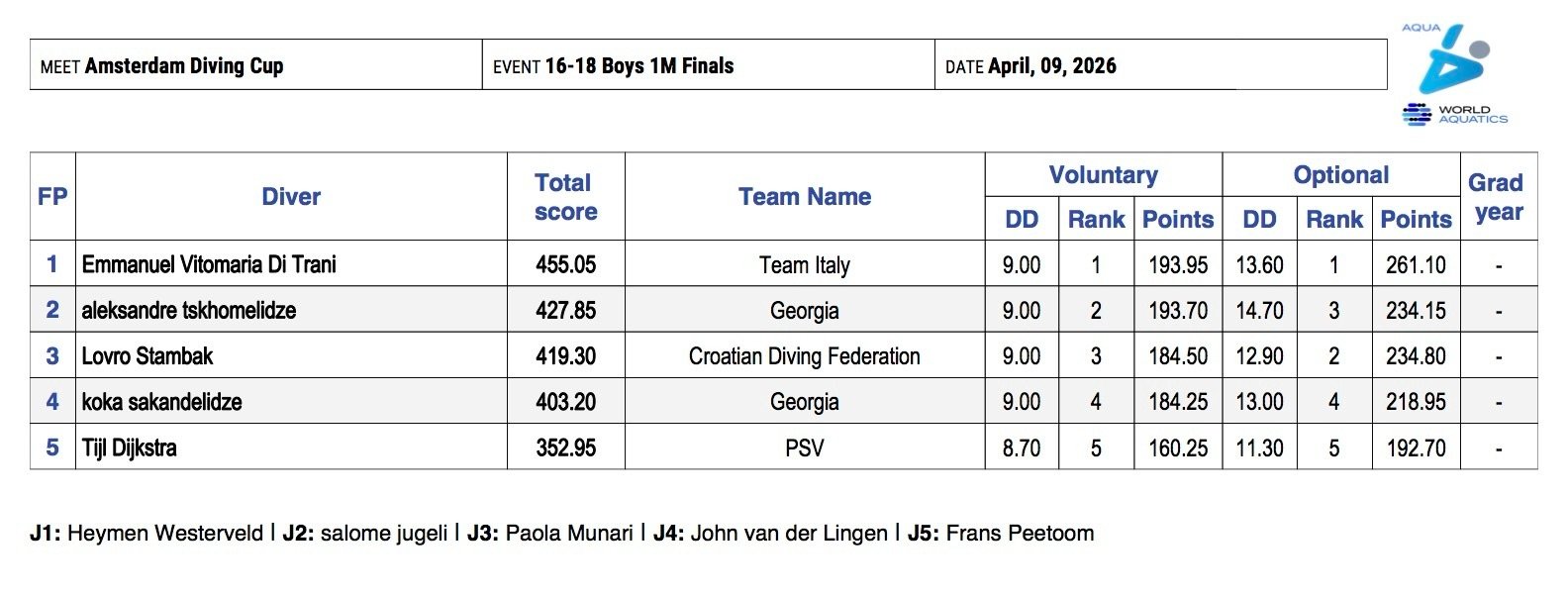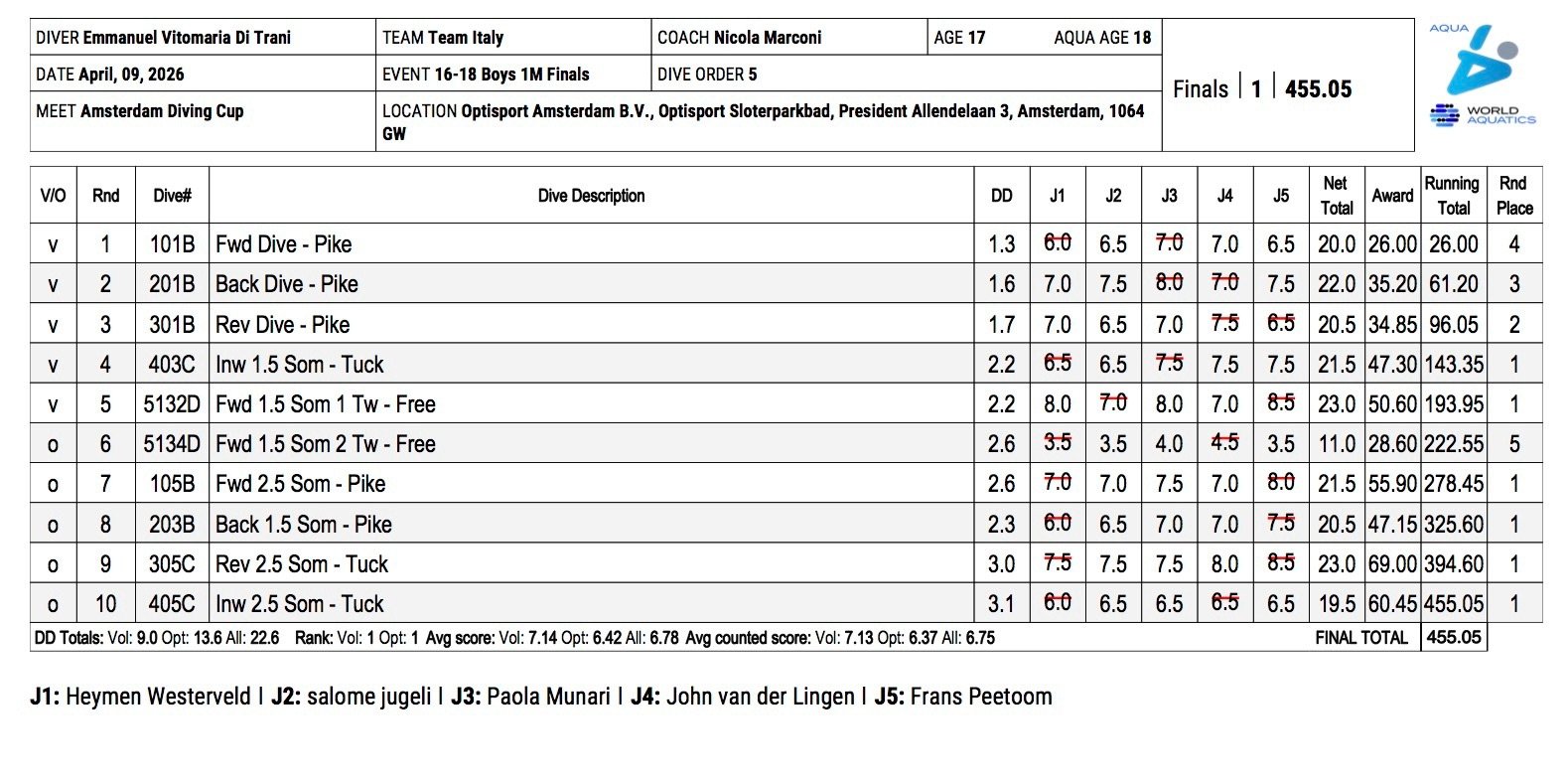 A concludere questa prima giornata di gare in bellezza Emmanuel Di Trani, nella finale dal trampolino di 1 metro maschile categoria A (Juniores). Il romano non ha iniziato nel migliore dei modi, “sporcando” l’ingresso in acqua dell’uno e mezzo avanti con due avvitamenti, ma dopo questo errore non ha più abbassato la guardia. Grazie ad un ottimo doppio e mezzo rovesciato raggruppato ha ripreso il comando della classifica e lo ha mantenuto fino alla fine, sopravanzando il tuffatore georgiano Aleksandre Tshkhomelize e tuffatore croato Lovro Stambak. Per lui 455.05 punti e ovviamente la prima posizione.