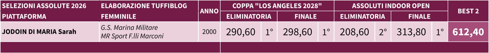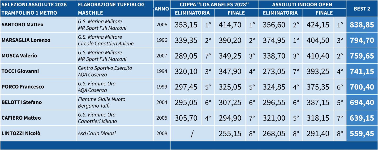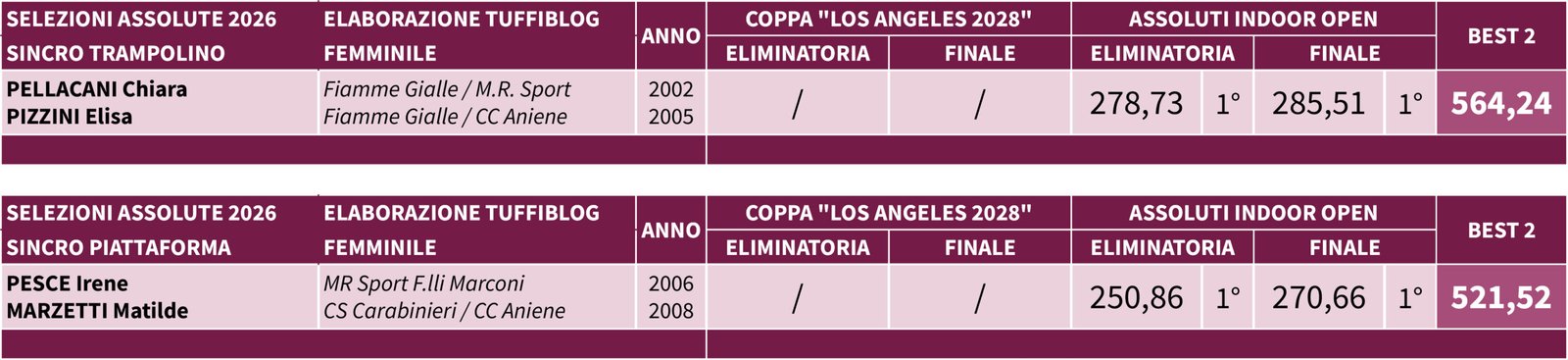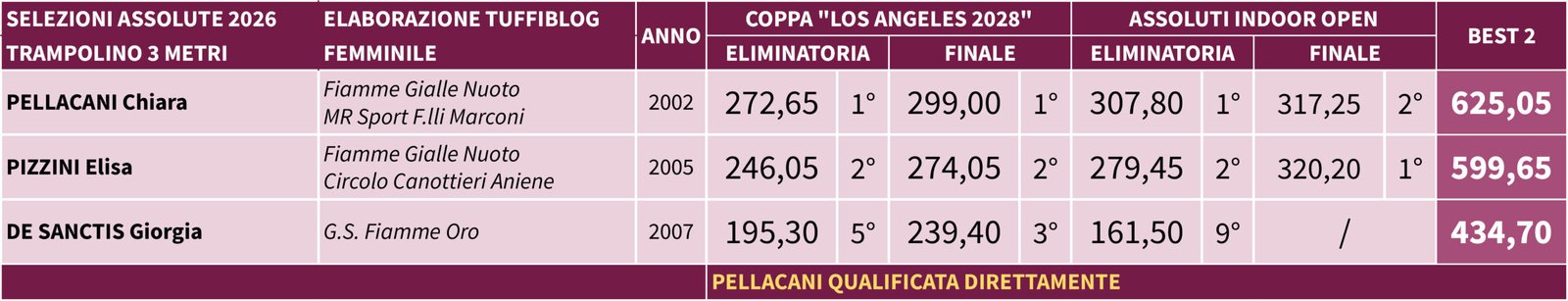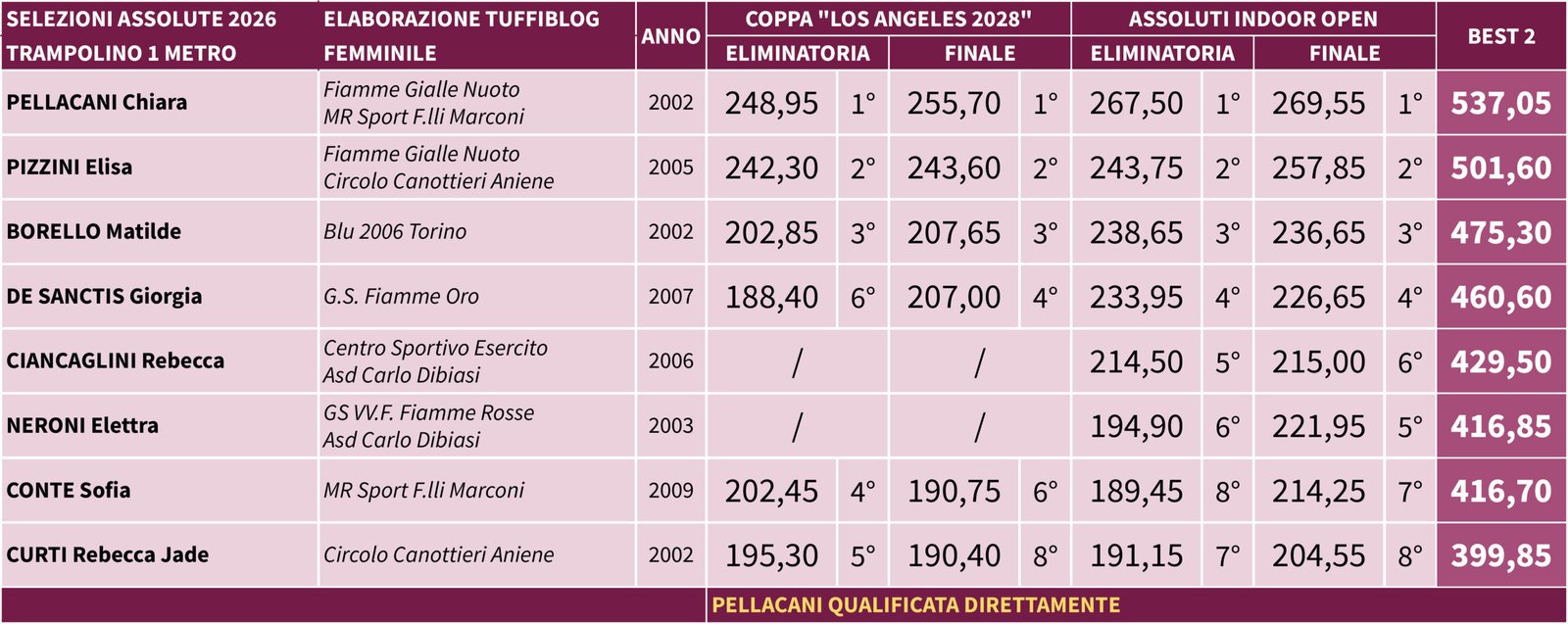Ricordiamo che il regolamento della Federnuoto, pubblicato a metà dicembre, stabilisce che è già qualificata la sola Chiara Pellacani (GS Fiamme Gialle/M.R. Sport) nelle specialità dal trampolino, mentre tutti gli altri posti in individuale e i posti delle coppie sincronizzate sono “liberi” e destinati ai migliori tuffatori, sommando i 2 migliori punteggi ottenuti nella Coppa “Los Angeles 2028” disputata a febbraio a Trieste o nei Campionati Assoluti indoor dello scorso weekend, ottenuti in eliminatoria o in finale. Il regolamento stabilisce anche il minimo di tuffi ad alto coefficiente di difficoltà da portare nel programma affinché un punteggio sia valido.