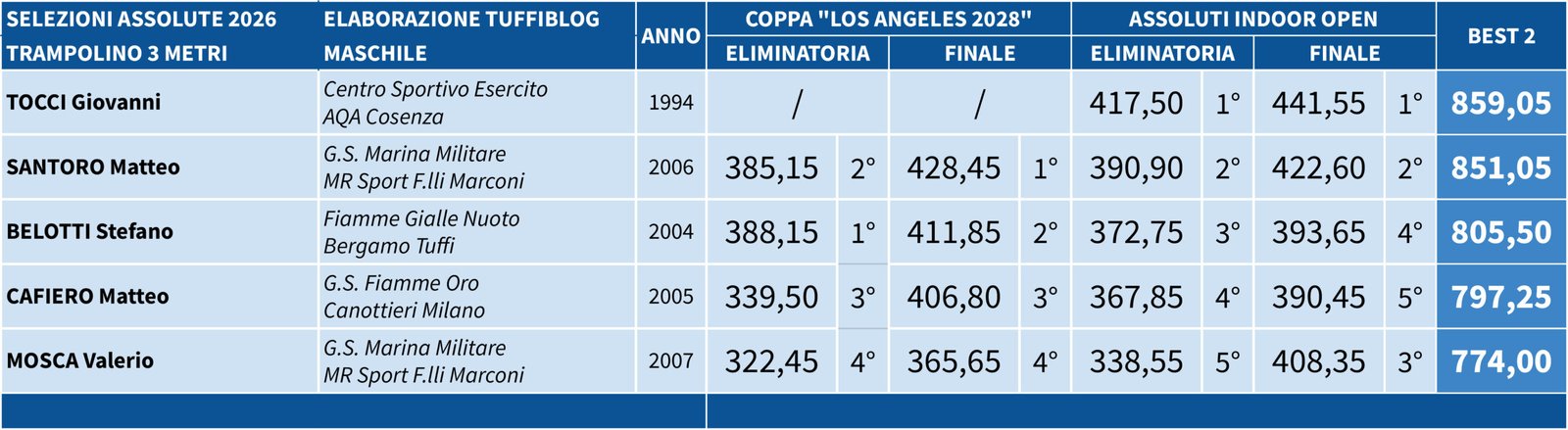 Ben cinque i concorrenti dal trampolino 3 metri, con Tocci che questa volta si è ritrovato a ribaltare i pronostici, riuscendo a rimontare una classifica molto difficile con una sola gara a disposizione: con il super punteggio ottenuto in finale si è assicurato la prima posizione, alle spalle di Santoro, che sarà dunque il secondo selezionato.