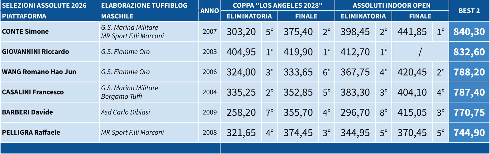 Mai così partecipate, invece, le selezioni dalla piattaforma, con sei concorrenti under-23 che hanno portato programmi più che competitivi. Il primo posto è appannaggio di Simone Conte (GS Marina Militare/M.R. Sport), che con l’ottima gara in finale agli Assoluti ha sopravanzato Riccardo Giovannini (GS Fiamme Oro), che fino a quel momento aveva guidato la classifica. Sono dunque confermate le scelte dello scorso anno in questa specialità.