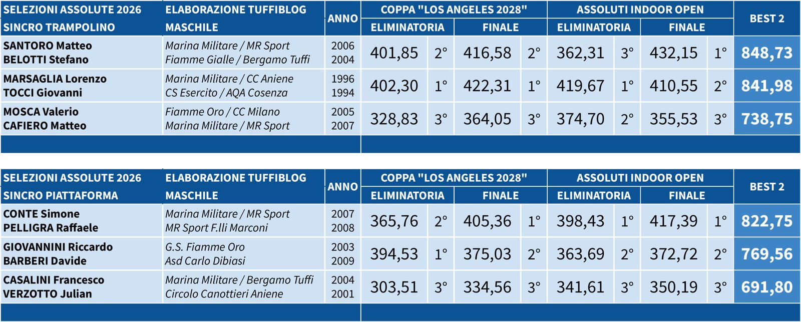 Anche le selezioni delle gare sincronizzate sono state molto interessanti: particolarmente incerta quella dal trampolino, con la coppia Santoro-Belotti che ha superato di pochissimo i veterani Tocci-Marsaglia soltanto con la finale degli Assoluti, ribaltando i pronostici.